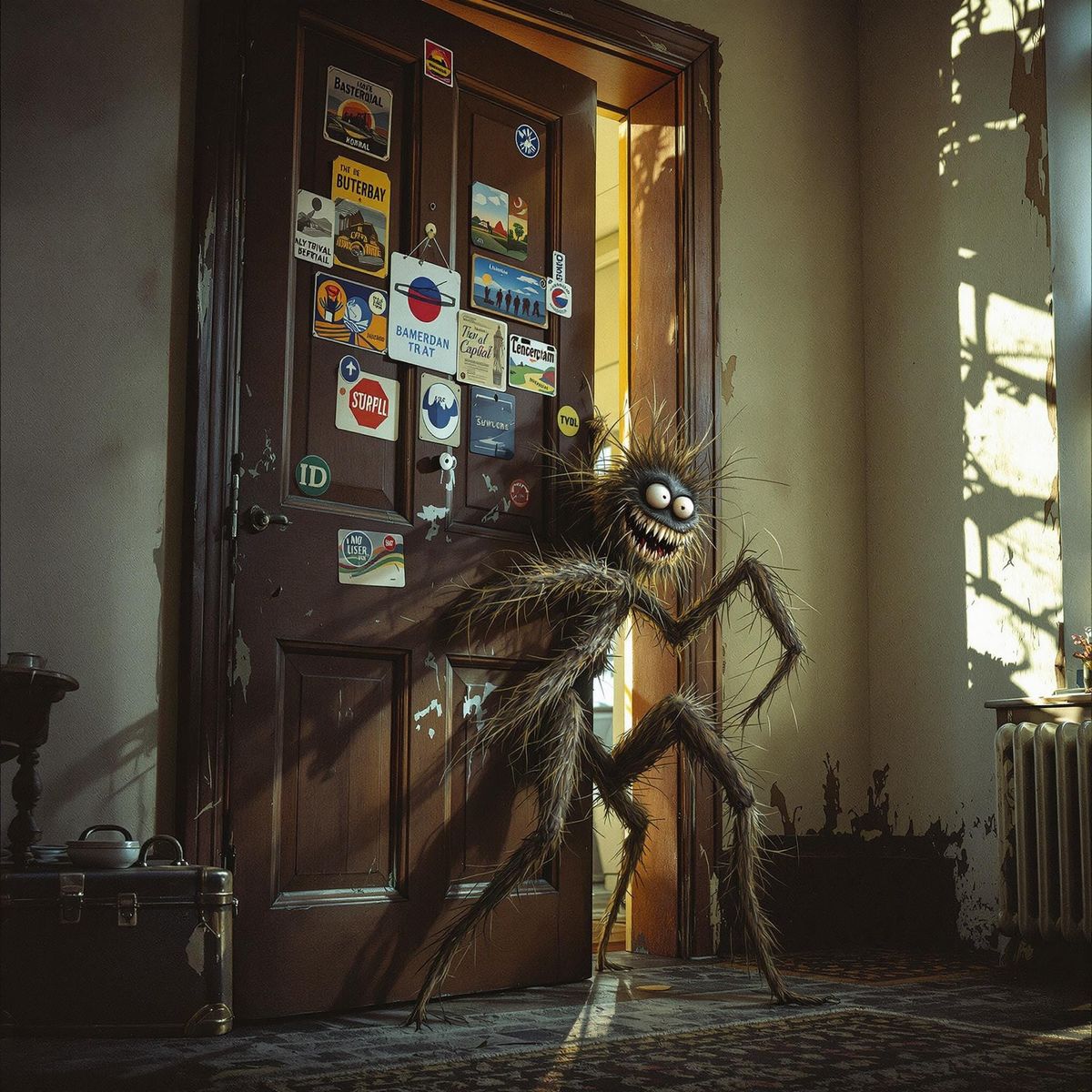 This image shows an anthropomorphic spider with a suitcase clinging to a worn door in an Amsterdamse School-style building. The image features hyper-detailed, vibrant neo-traditional elements with a post-apocalyptic twist.