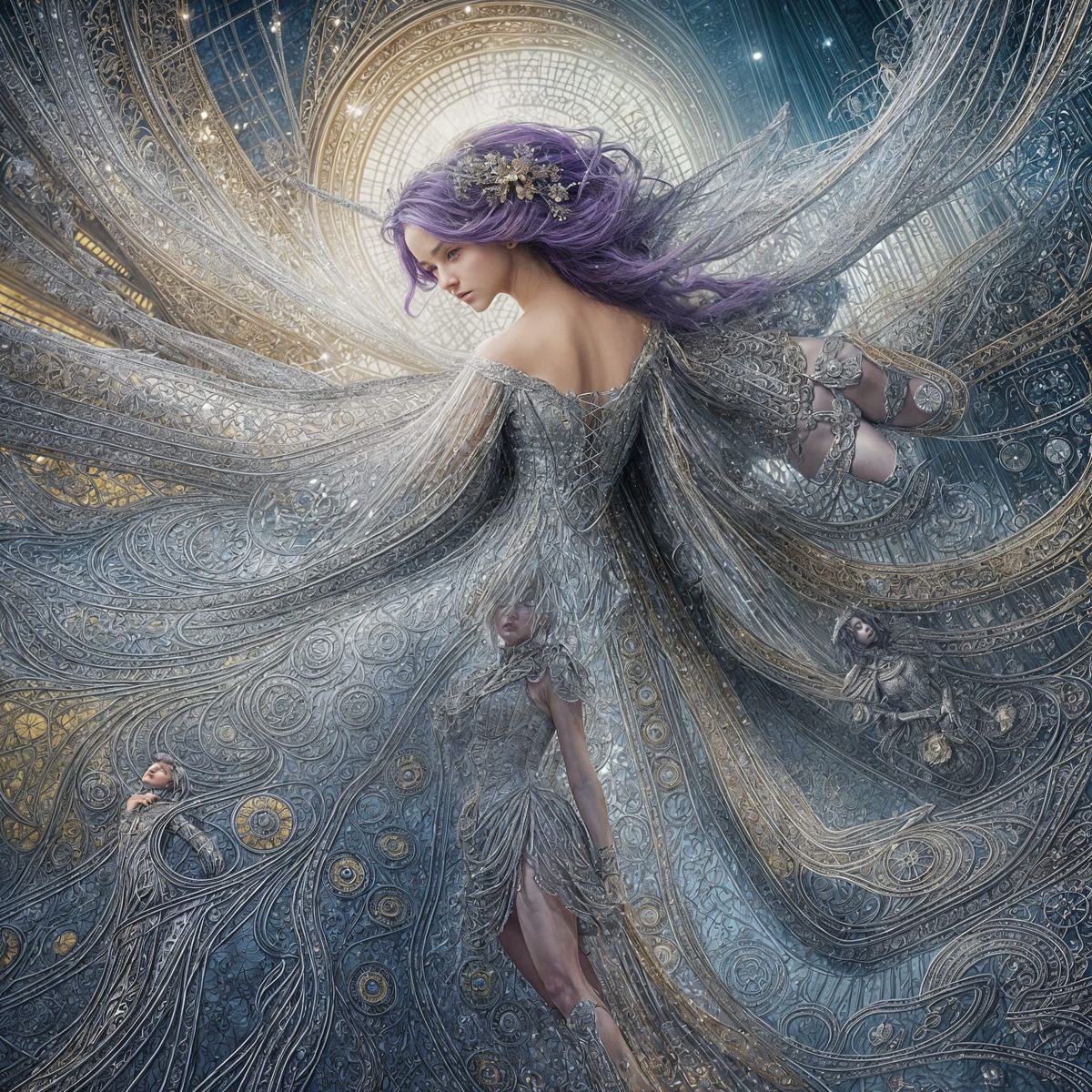 This image features a young woman in a Victorian cyberpunk style, wearing a unique silver and gold lace dress with puff sleeves and stiletto boots. She is in a library setting.