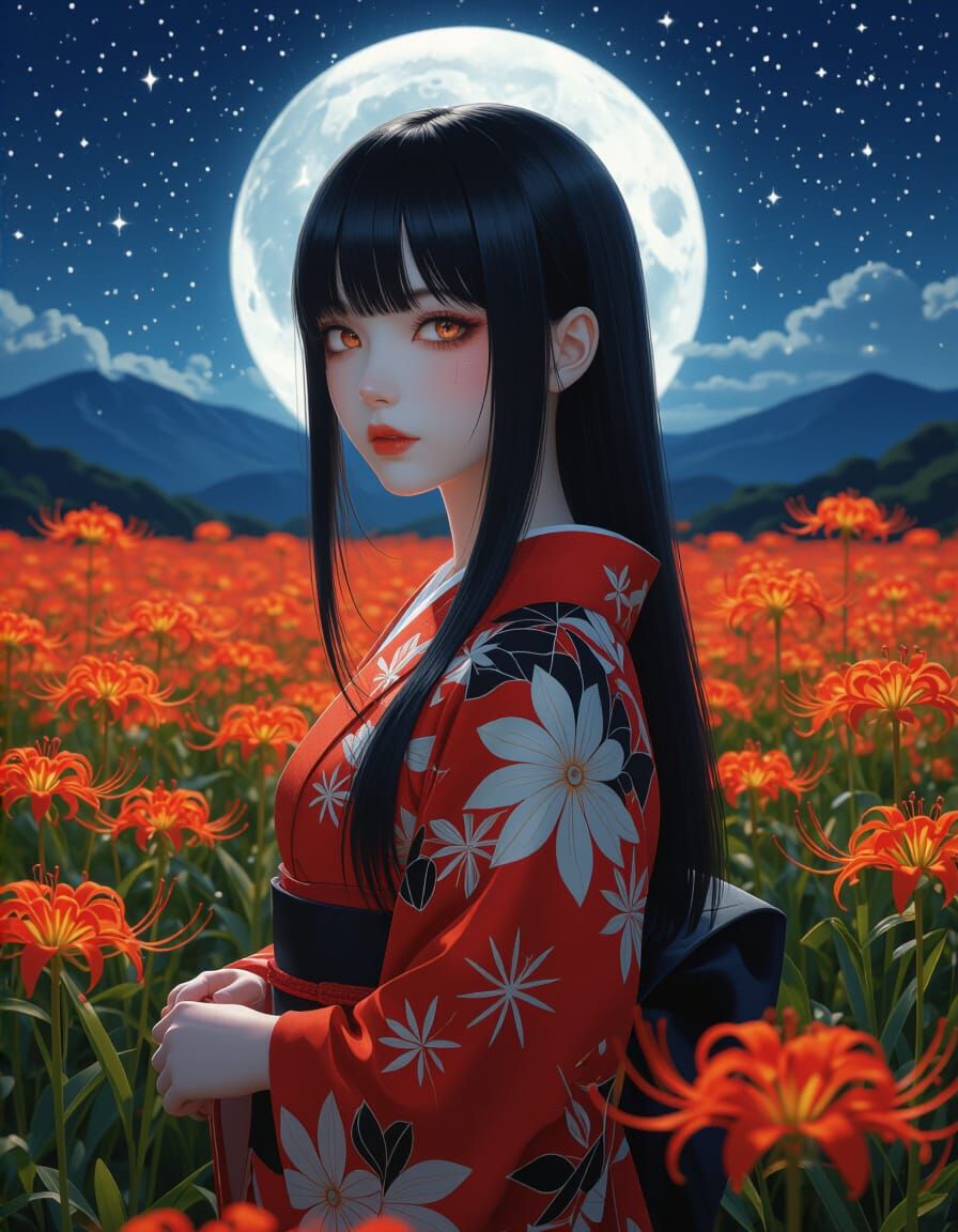 This image shows a beautiful young Japanese woman in a red and black kimono standing in a field of spider lilies under a full moon. The portrait features realistic details and dark contrast, as 3D anime art.