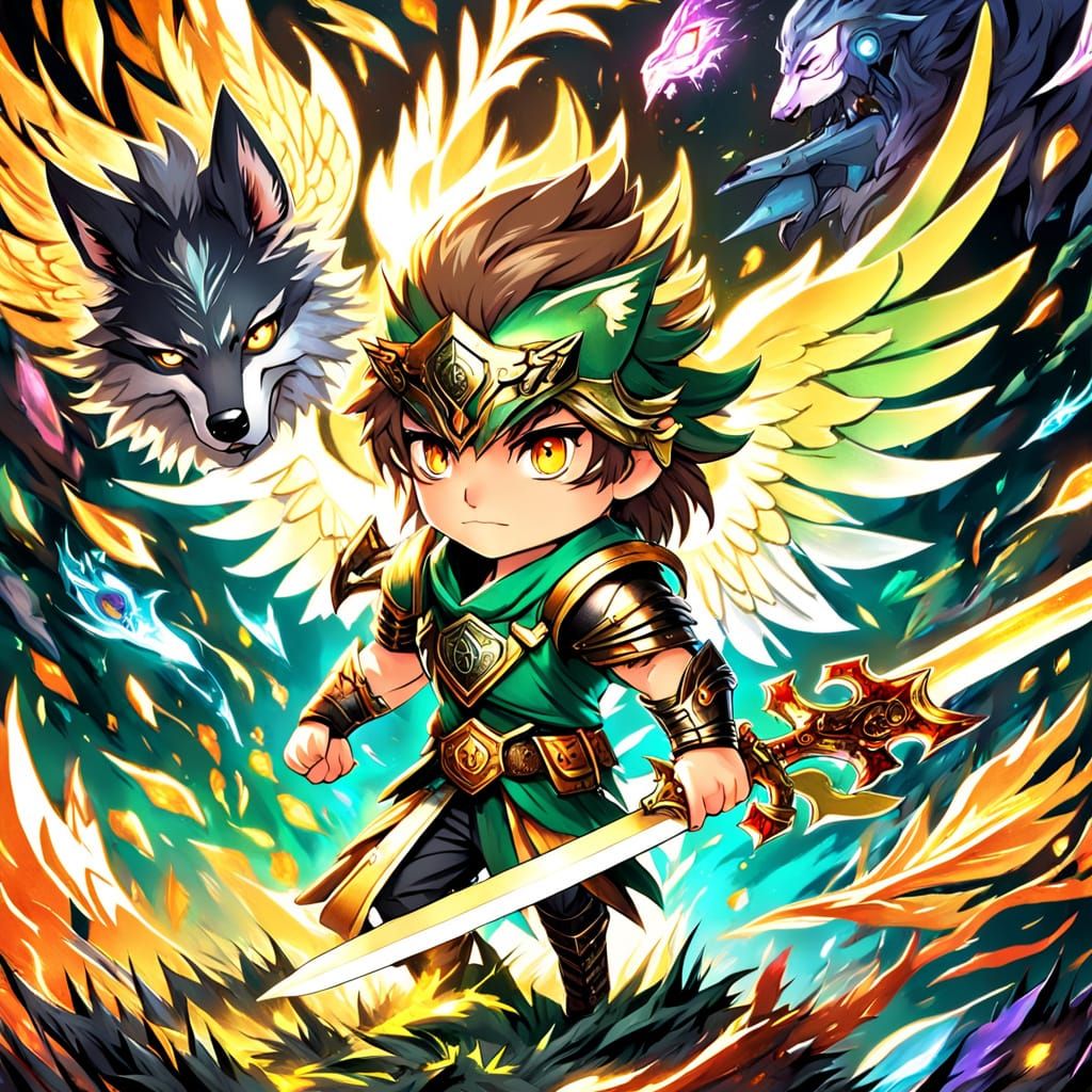 This image shows a chibi-style anime wolf boy holding a sword. The character features metallic green eyes, brown hair, and wings, all rendered with vibrant colors and golden light in a fantasy aesthetic.