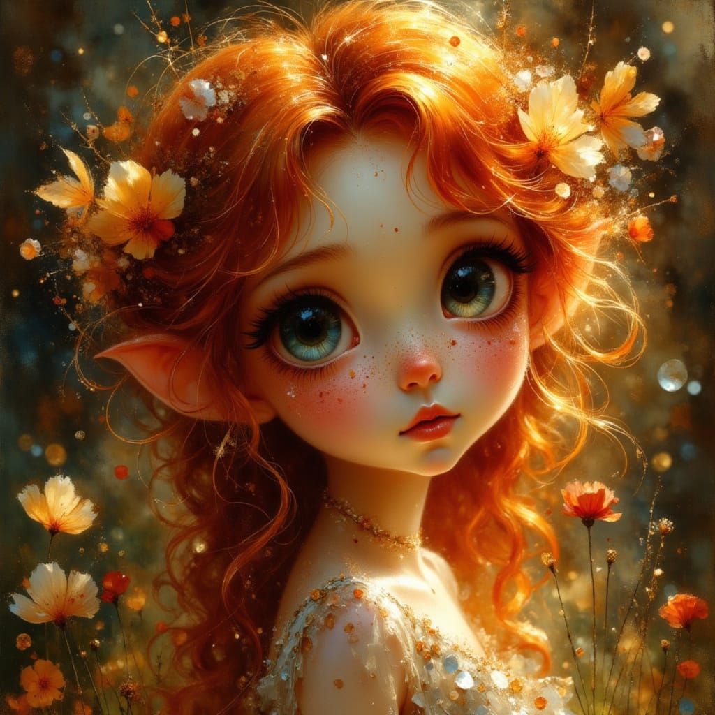 This image shows a close-up portrait of a magical fae with striking red hair, freckles and large eyes. The artwork has an ethereal and lively aesthetic.