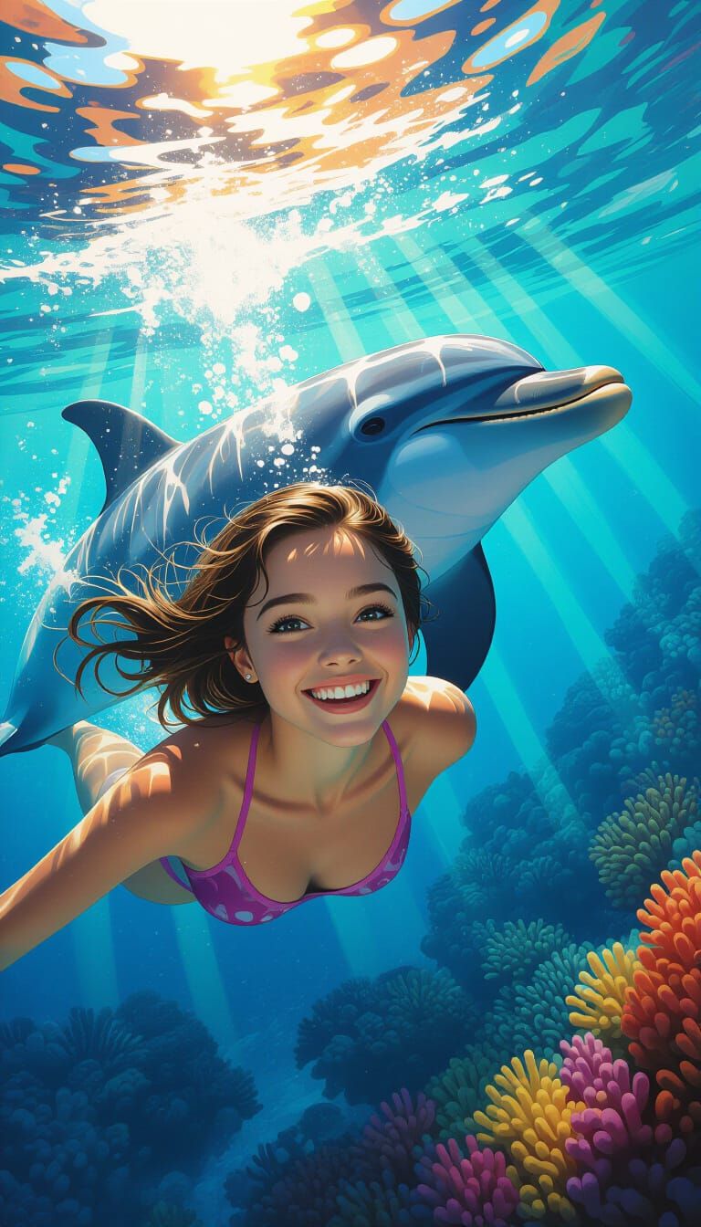 A vibrant image of a girl swimming with a dolphin amidst colorful coral. The radiant ocean scene is captured with dramatic lighting and intricate details, as 3D rendered digital art.