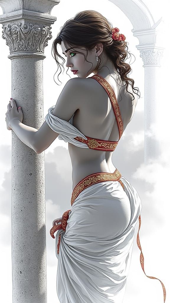 This stunning portrait depicts a beautiful Italian woman in a flowing red and gold toga, leaning against a worn Roman pillar, set against a kaleidoscopic sunset background with soft clouds.