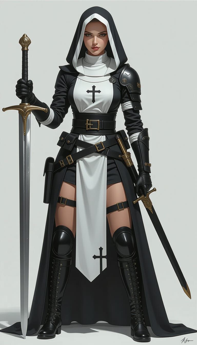 A hyper-detailed, ultra-realistic full body portrait of a confident female warrior nun gripping a sword. She wears a tactical habit, gloves, and boots on a plain white background.