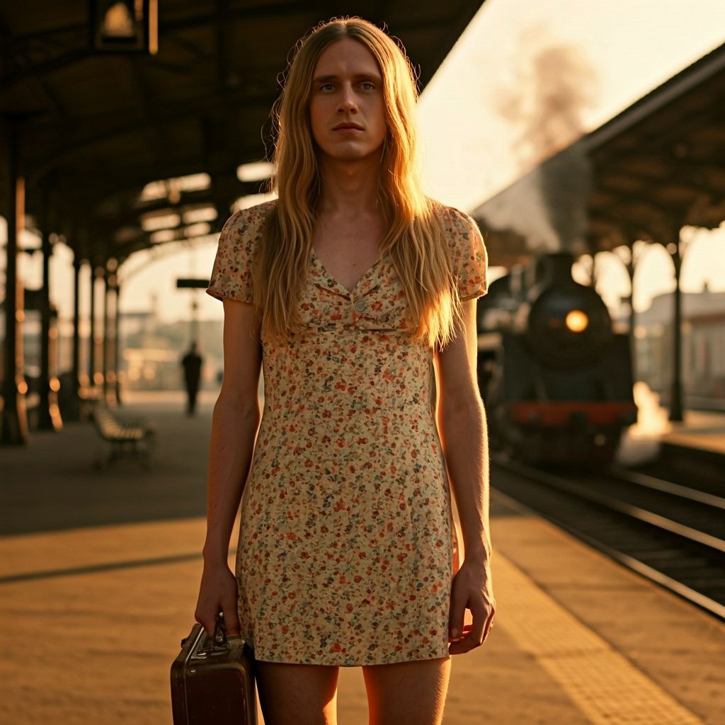 A cinematic film still capturing a young individual with blonde hair in a vintage floral dress at a train station. Bathed in golden hour light, the scene evokes nostalgic melancholy with steam and film grain.