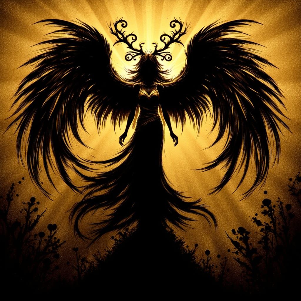 This image shows a sad, strikingly beautiful Norse goddess of forbidden love. The figure is depicted with black paint on backlit goldenrod glass, creating a unique and dramatic effect.