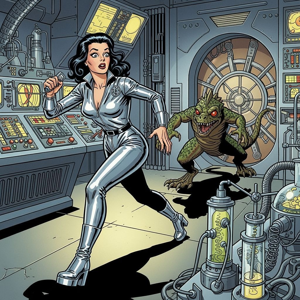 This image shows a woman fleeing a menacing lizard creature in a futuristic laboratory. The illustration captures a retro science fiction aesthetic with gleaming chrome and vibrant colors.