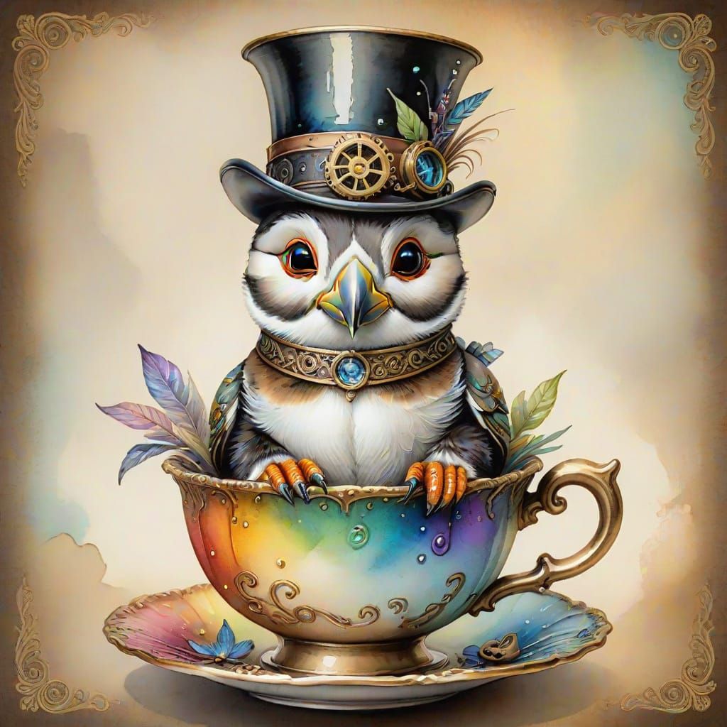 This image shows a steampunk-themed baby puffin wearing a top hat sitting inside an ornate teacup. The watercolor painting features iridescent rainbow colors, sparkling gold highlights, and soft focus.