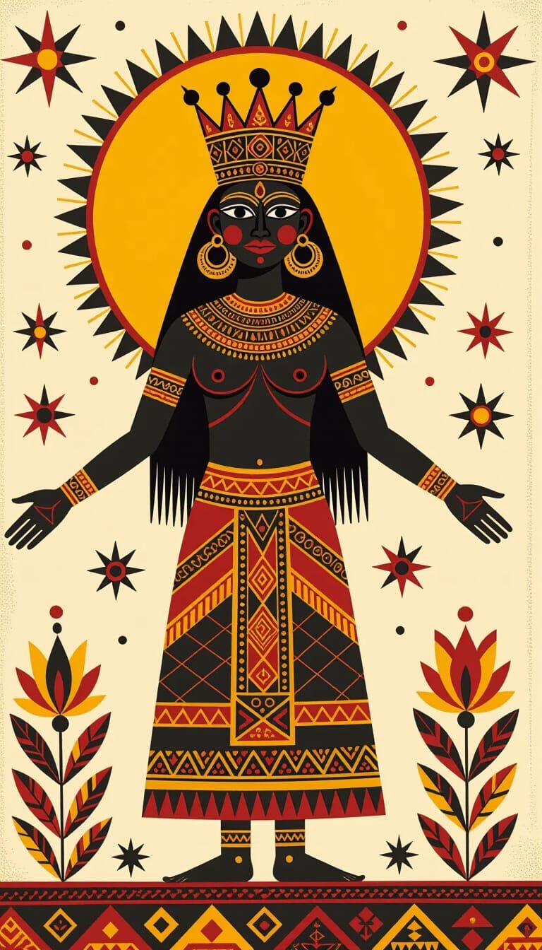 This image shows a regal, dark-skinned figure with a crown and geometric patterns, depicted in an ancient tribal art style. A radiant sunburst and celestial motifs surround the figure.