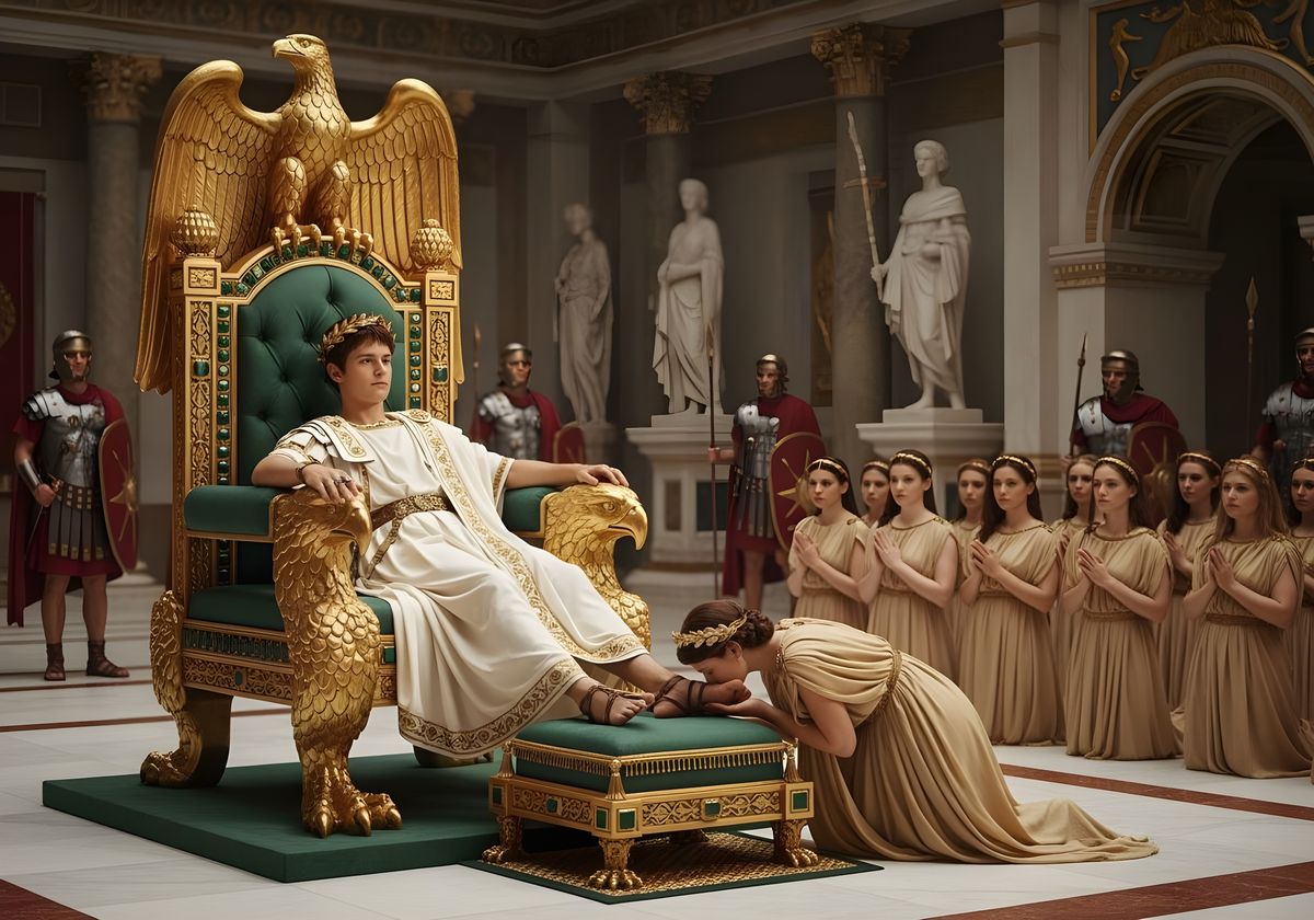 This image shows Emperor Nero lounging on a golden throne as priestesses kneel before him. The scene, reminiscent of ancient Rome, is captured in a professional photograph with meticulous detail and rich color.