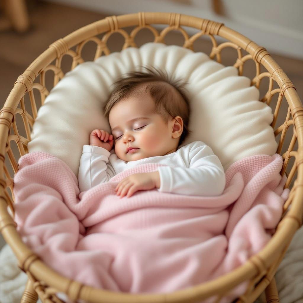 This photorealistic image captures a tiny baby girl sleeping soundly in a bamboo cradle. Soft studio lighting enhances the peaceful atmosphere of the indoor scene.