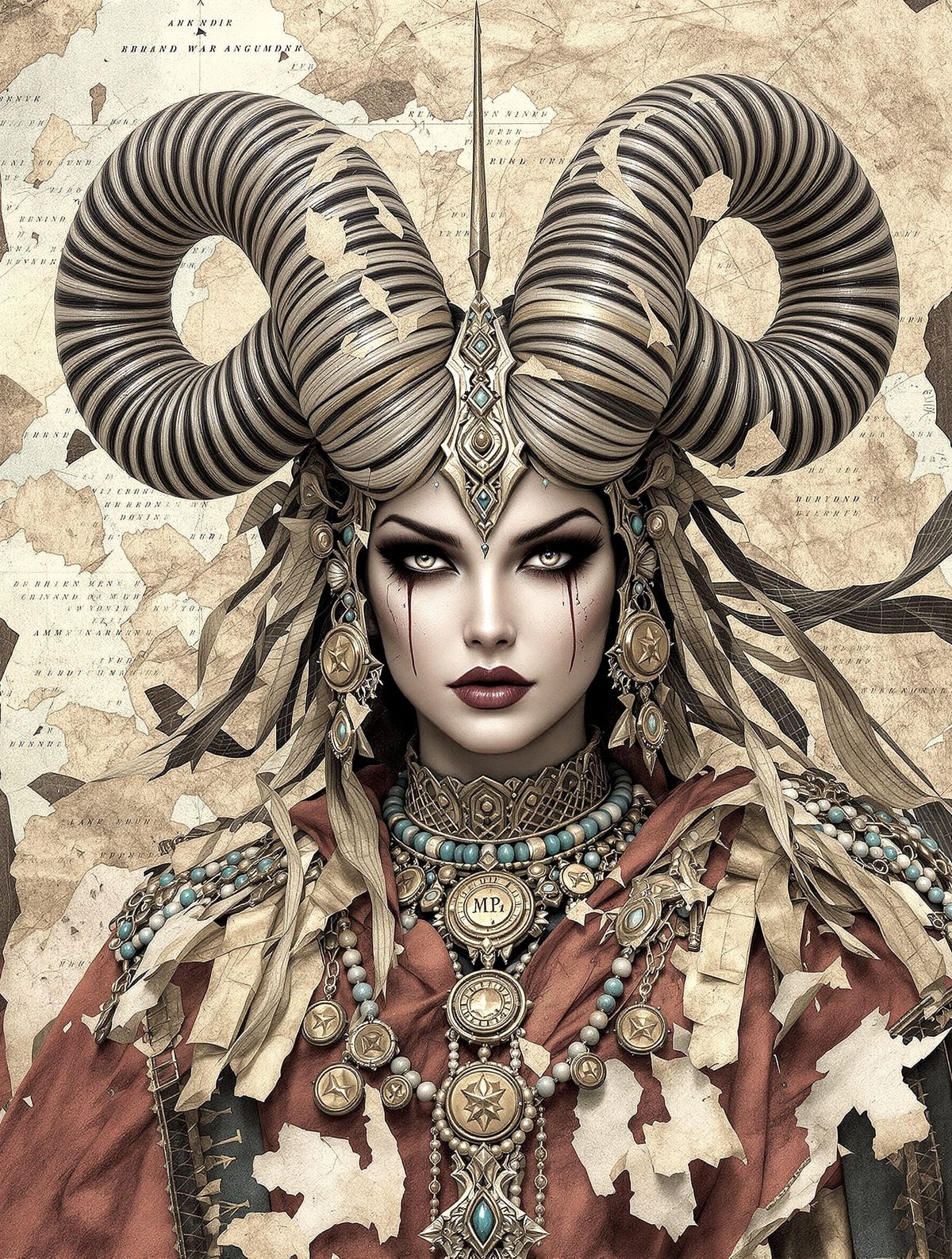 A striking picture of a war goddess with spiral horns, wearing gold medallions and turquoise beads. The hyper-realistic collage evokes ancient relics and flowing fabrics.