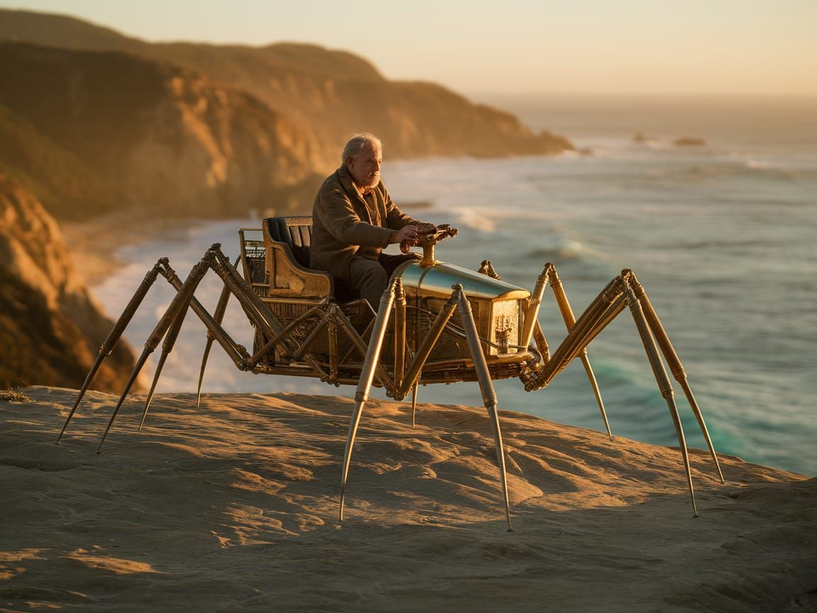 A photograph depicting an elderly man piloting a vintage, intricately detailed spider-like vehicle along the rugged California coastline, bathed in the warm glow of the late afternoon sun. The spider-vehicle, crafted from polished brass and weathered wood, traverses a rocky outcrop overlooking the turquoise ...