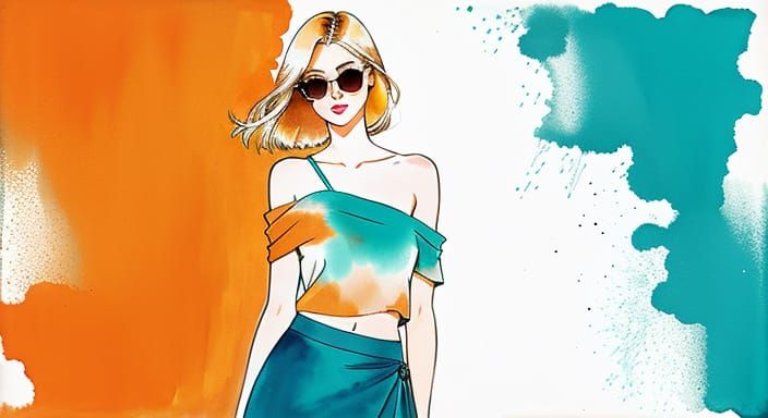 This image showcases a minimalist ink and watercolor fashion sketch featuring a whimsical blonde model. The artwork uses fluid washes of orange and teal against an abstract splash background.