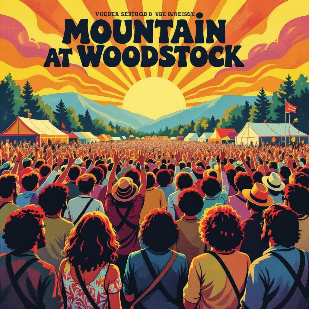 This poster for "Mountain at Woodstock" captures a vibrant music festival scene with psychedelic art influences. Detailed gouache painting with flowing lines and bold patterns evokes 1960s energy.