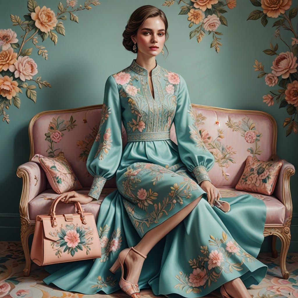 This image showcases a woman in a vibrant dress with matching accessories. The medium shot highlights the intricate embroidery and fabric patterns, rendered in a pastel color scheme with soft, natural lighting.