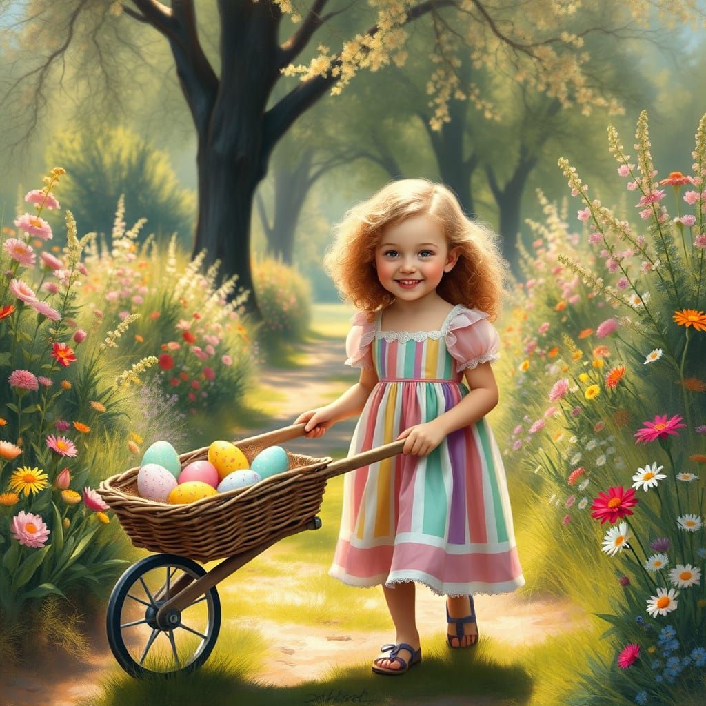 This image shows a young girl with curly blonde hair and a bright smile, surrounded by a lush garden filled with blooming flowers and towering trees. She wears a delicate pastel rainbow-colored dress and pushes a wicker wheelbarrow filled with colorful Easter eggs, evoking a sense of whimsy and fantasy i...