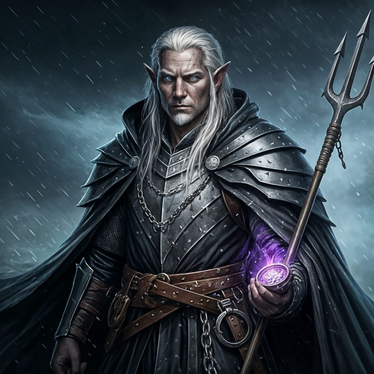 A digital painting of a weathered dark elf seafarer. The character is depicted with a trident and glowing compass, salt crystals clinging to his cloak.