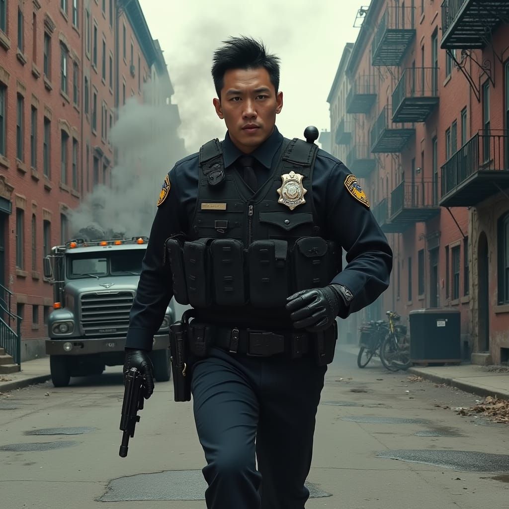 This image shows a hyper-realistic depiction of a Boston police officer running down a rundown neighborhood street, with a damaged armored truck in the background and smoke billowing from its shattered windows.