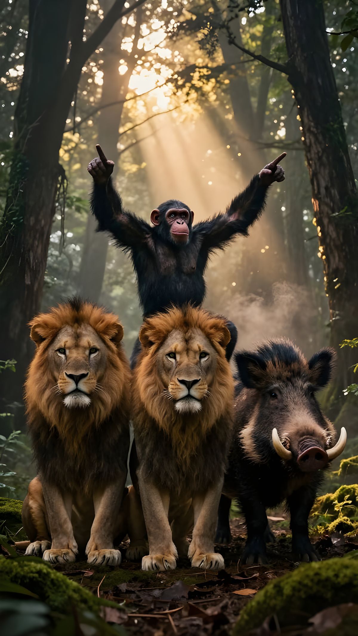 A photorealistic fantasy scene depicts two lions, a boar, and a chimpanzee in an ancient forest at dawn. Golden light streams through trees, highlighting mist and dramatic contrast.