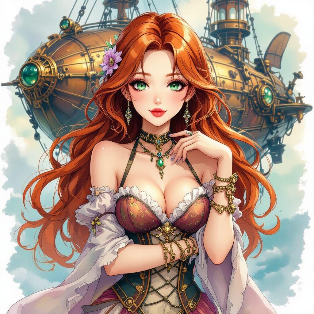 A vibrant watercolor image of a playful anime character with auburn hair and emerald eyes, posing in front of a detailed steampunk airship. The artwork evokes a dreamy, sensual aesthetic with refined brushstrokes.