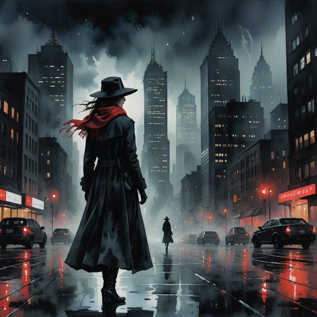 A watercolor silhouette of a woman in a black coat and red scarf stands in a foggy city. The wet ground reflects the lights, enhancing the noir aesthetic.