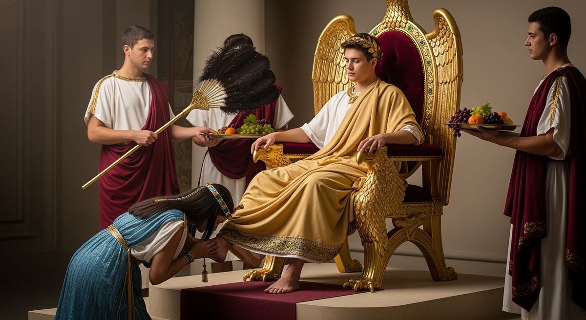 This image shows a young Roman emperor on a gold and emerald throne as the Queen of Egypt bows before him. The scene is opulent, with rich detail and natural lighting, reminiscent of classical paintings.