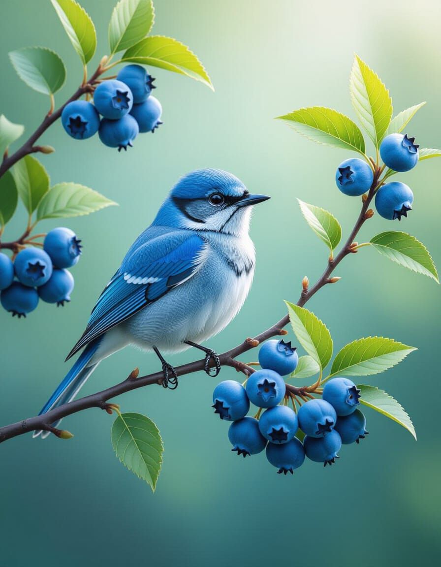 This stunning digital matte painting showcases a cute blue bird perched on a blueberry tree branch. The artwork is detailed, atmospheric, and features a maximalist aesthetic.