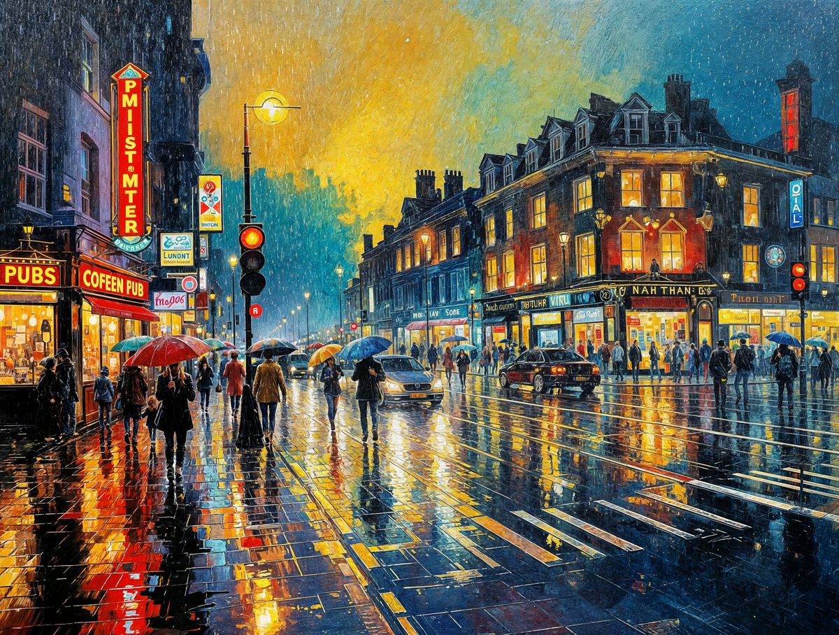 A vibrant oil painting capturing a rainy night scene in a modern town center. The painting shows reflections on the wet streets and neon signs, with impasto techniques and deep colors.