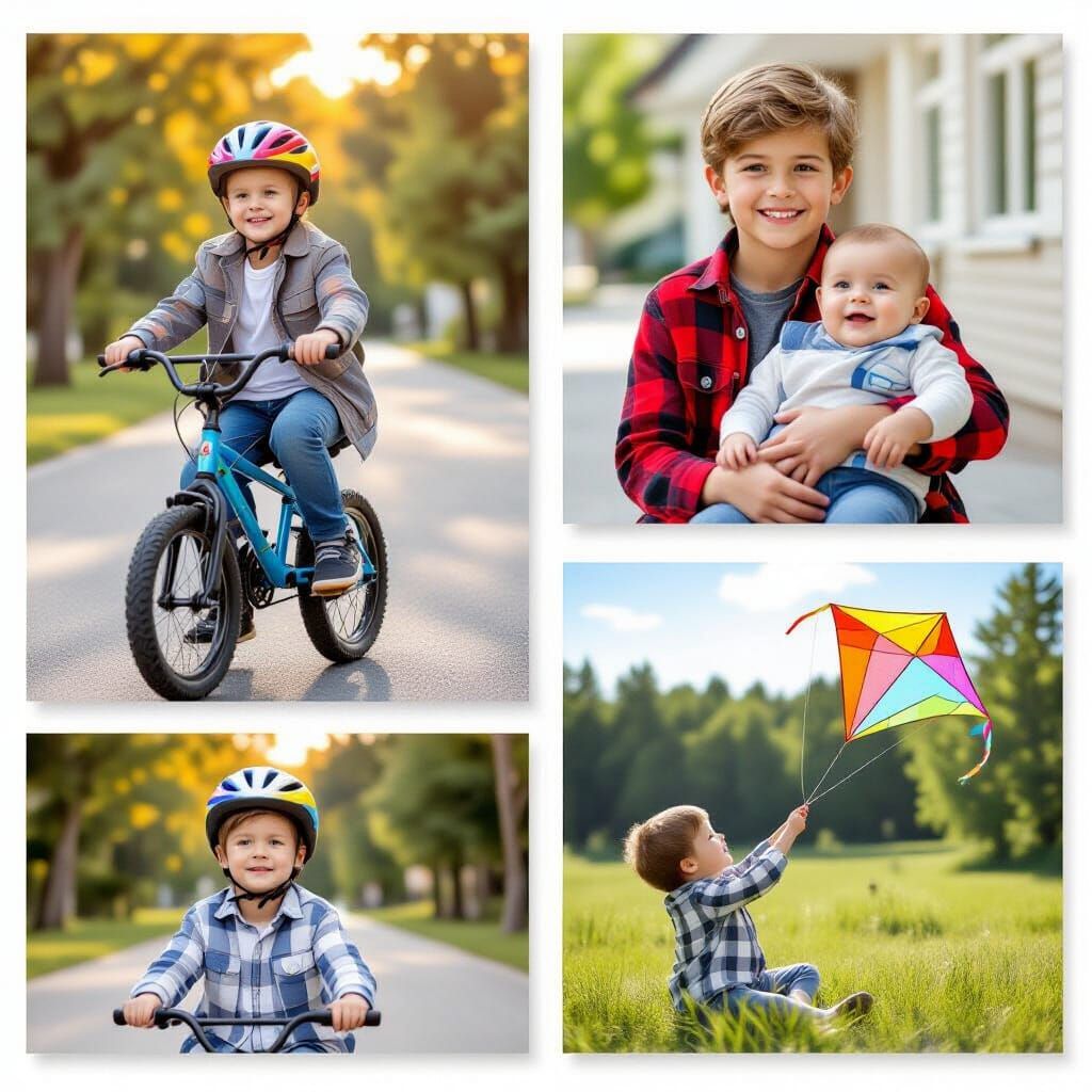 A series of three images depicting a young boy enjoying different childhood activities: riding a bicycle, holding his baby brother, and playing with a kite.