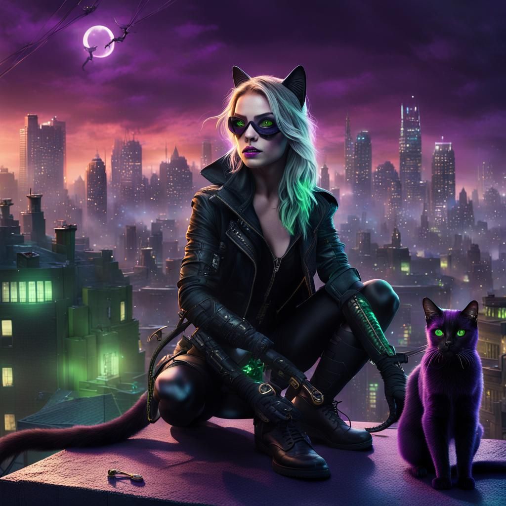 A detailed matte painting of Black Cat, reminiscent of Catwoman, posing on a Gotham rooftop. The fantasy concept art features vibrant purple and green hues, intricate textures, and dynamic lighting.
