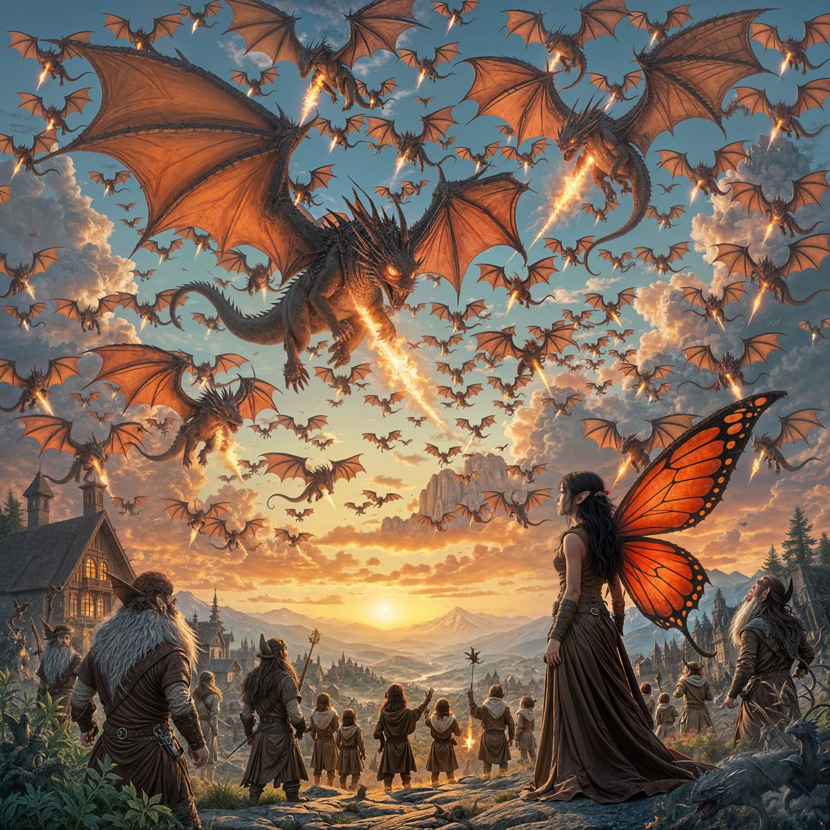 This image depicts a dramatic scene of numerous dragons flying in formation over a village of bearded, elf-like brownies. The brownies and a fairy with red wings gaze upwards as fire rains down from the sky.