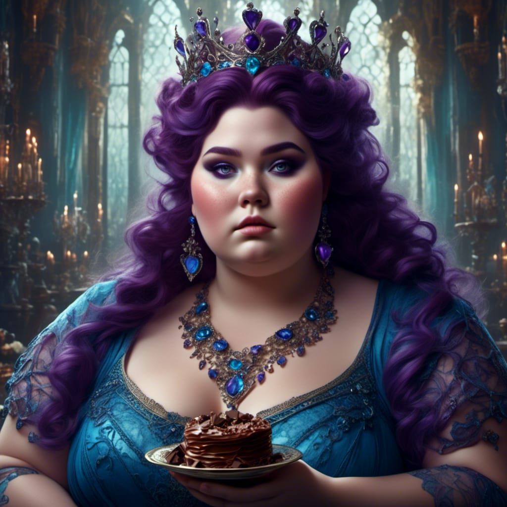 This image shows a stunning elf with dark chocolate hair and piercing blue and purple eyes. She has soft features, a heart-shaped face, and wears an ethereal blue dress with a delicate necklace and crown in hyperrealistic detail.