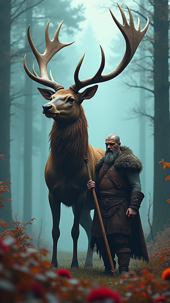 A striking picture of a stag and viking warrior in a misty forest. The Norse-inspired scene features rich colors and detailed textures, reminiscent of atmospheric matte paintings.