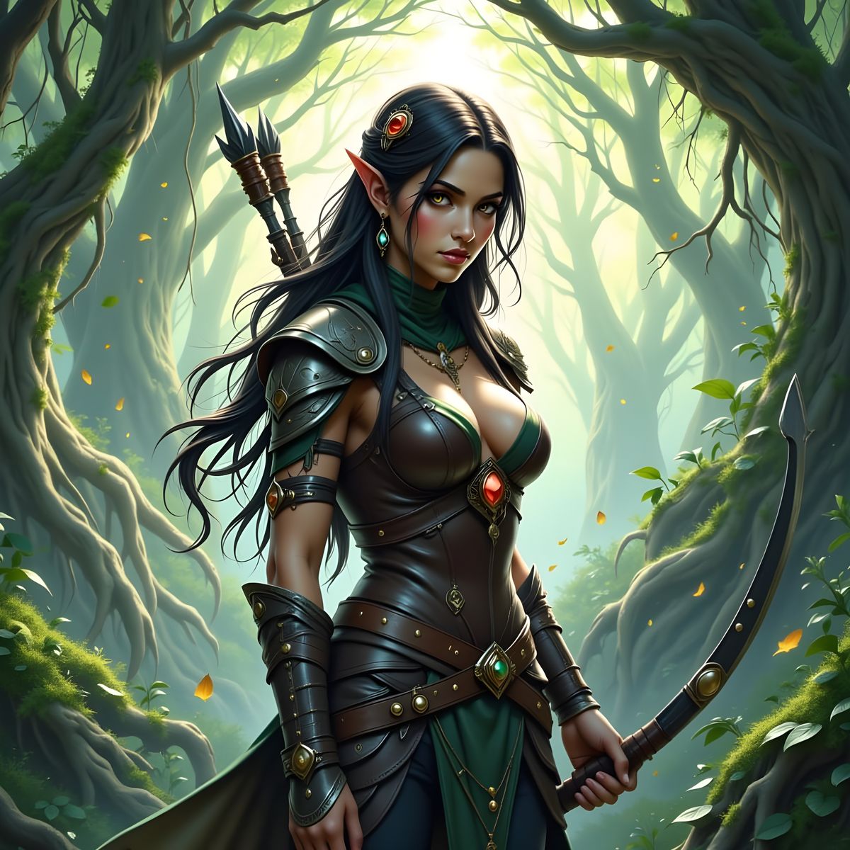 This image depicts an ancient elven huntress in leather armor, standing in a magical forest. Dramatic lighting highlights the serene yet powerful atmosphere.