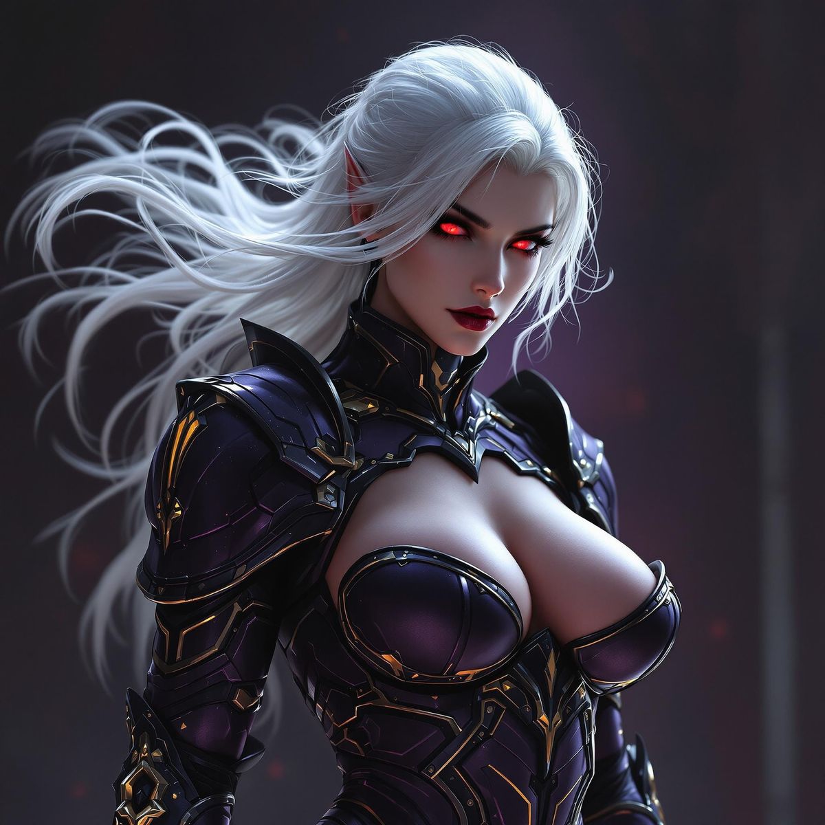 This image shows a captivating sci-fi inspired portrait of a muscular dhampir woman, clad in intricate latex armor, set against a dramatic backdrop with deep rich purple hues and golden yellow accents.