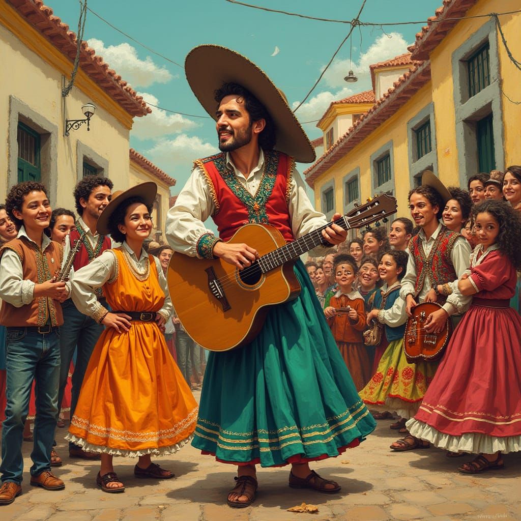 This image shows the Baker of Aljubarrota in traditional dress, amidst jubilant Portugal players. The folk-art style evokes earthy tones and textures.