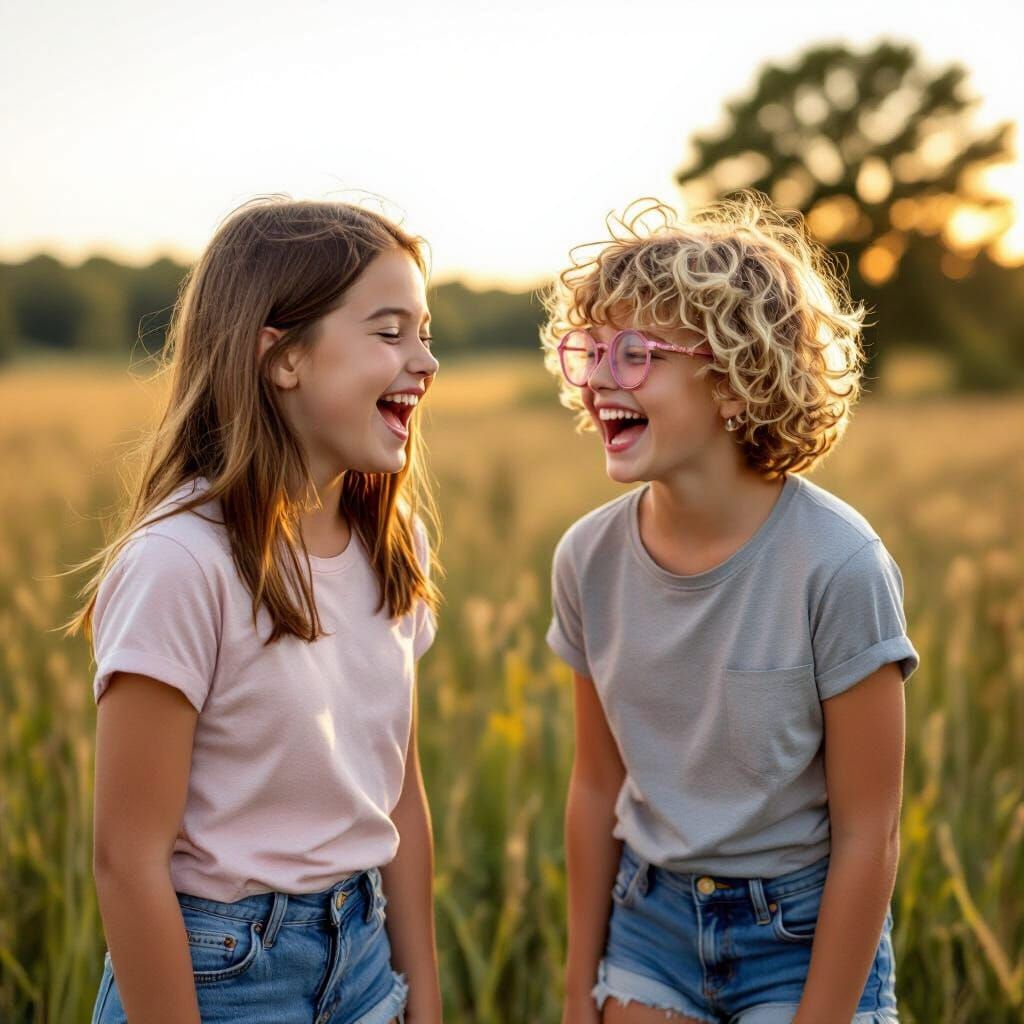 This photorealistic image captures two sixth-grade friends laughing and making funny faces in a field, bathed in warm golden hour light. High detail and shallow depth of field enhance the joyful moment.