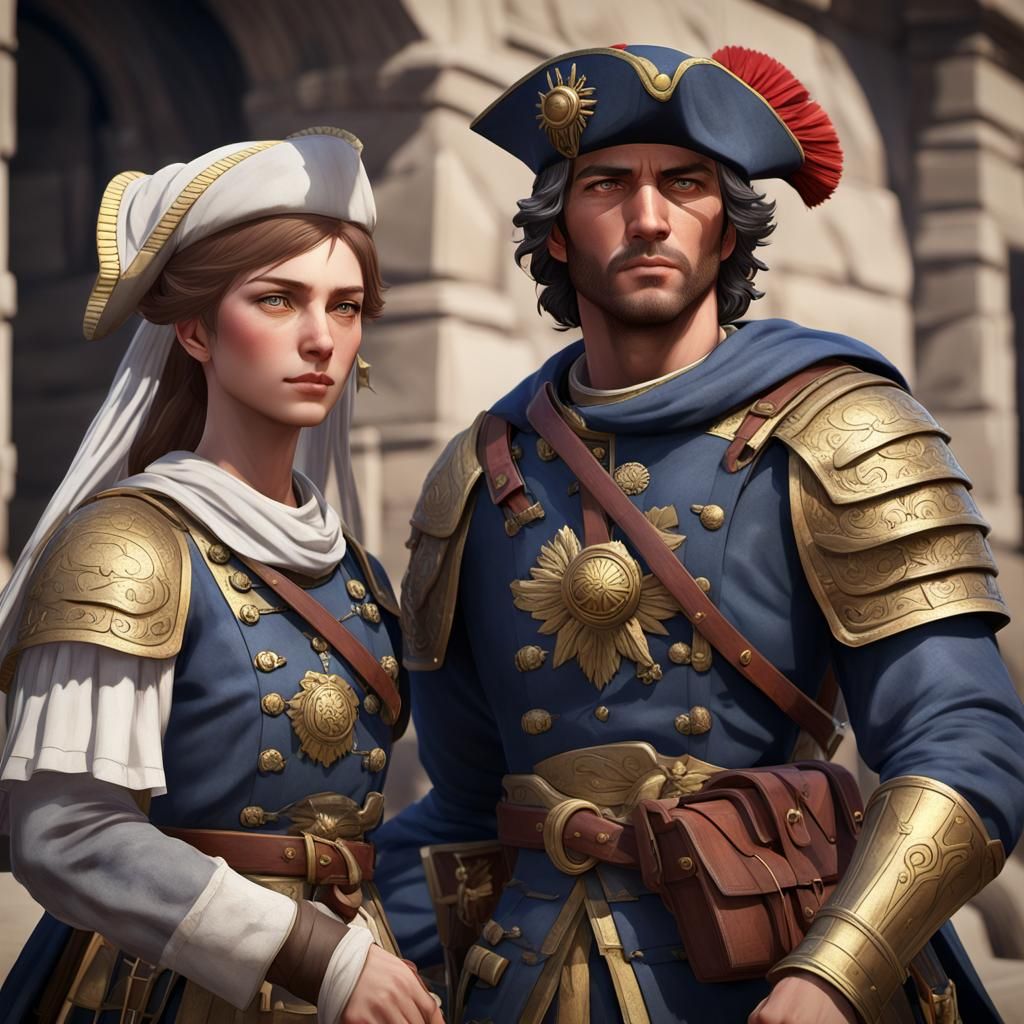 This image shows a Byzantine Roman soldier meeting a female spy. The image is rendered as 3D anime art with extreme detail, inspired by WLOP, and presented in breathtaking 8k resolution.
