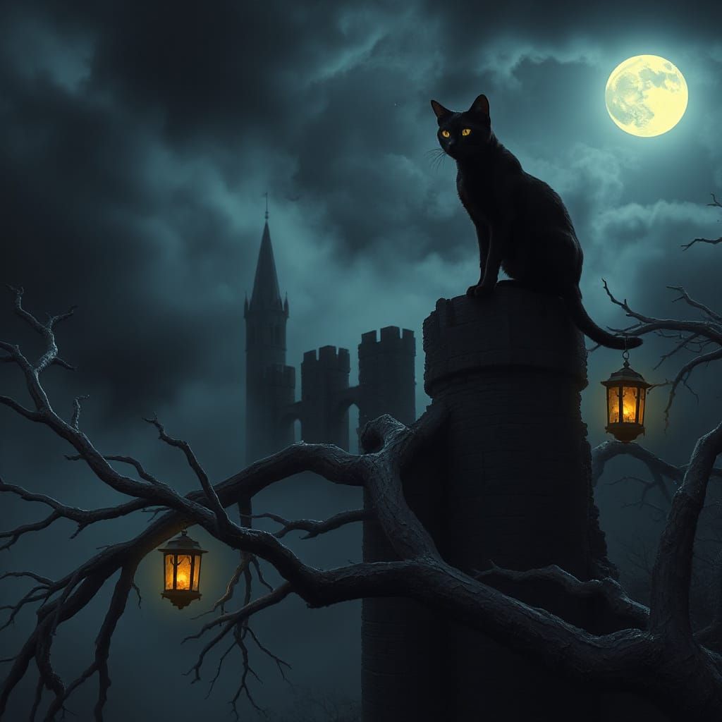 A haunting image of a dark cat silhouette perched on a ruined castle wall, surrounded by twisted tree branches, with glowing eyes in a mystical, moonlit nightscape, blending Beksiński's dark style with Giger's biomechanical details and Dean's dreamlike quality.