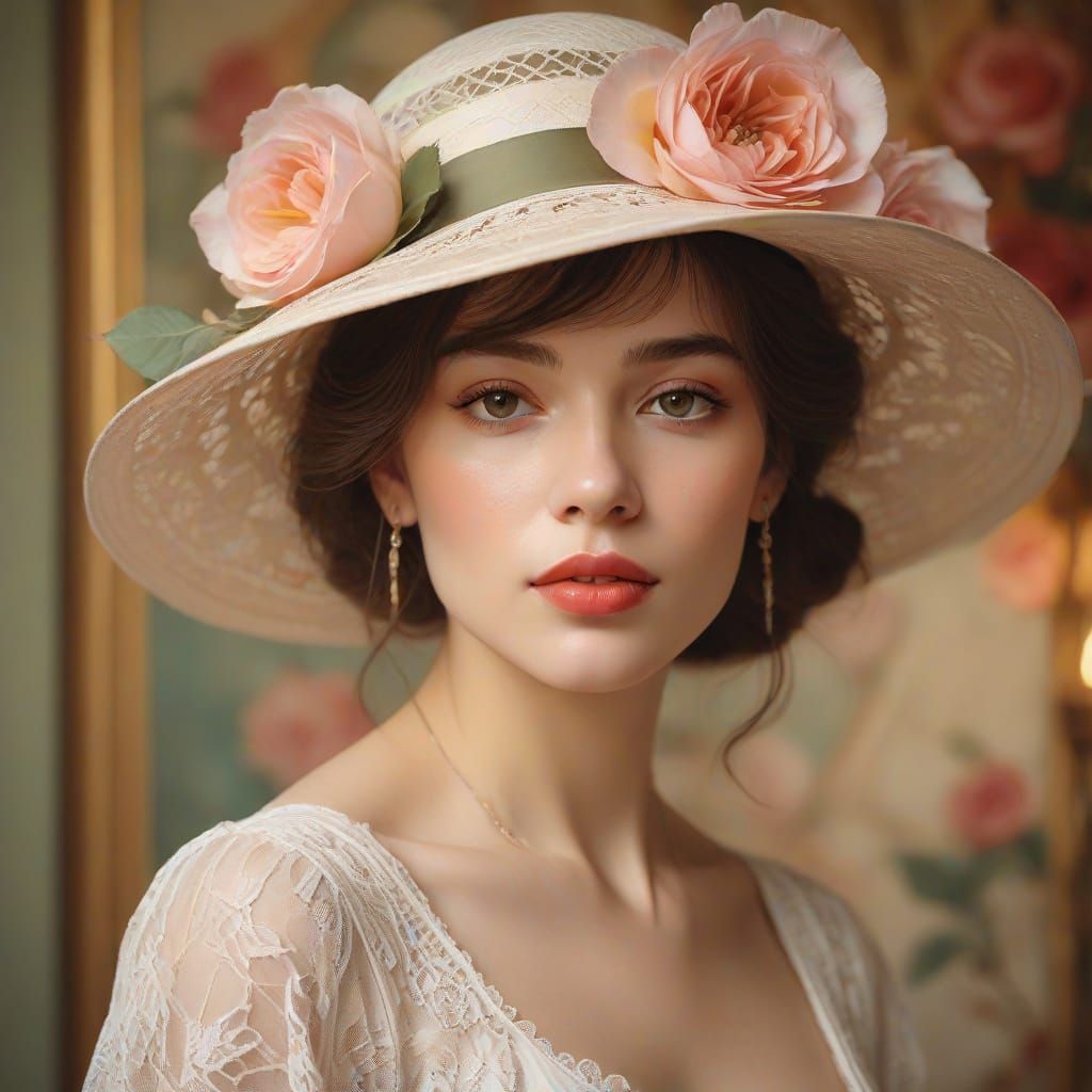 This image shows a medium shot of a woman in a rose-covered hat, set against the Paris skyline. The portrait evokes an Art Nouveau aesthetic with watercolor style, delicate lace, and warm golden lighting.