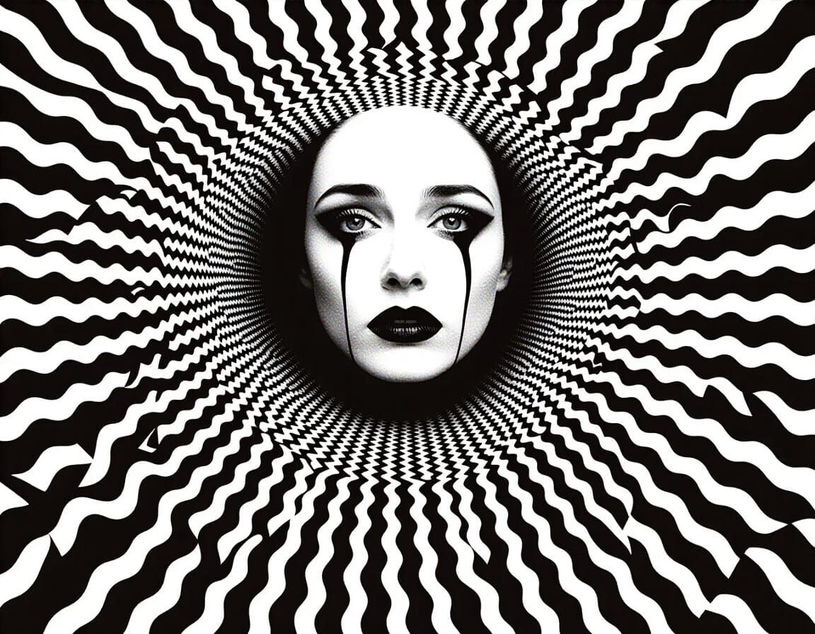 A close-up image reveals emotive human eyes filled with tears. Stark black and white contrast and dramatic shadows evoke a poignant atmosphere. The image is reminiscent of classic monochrome photography.