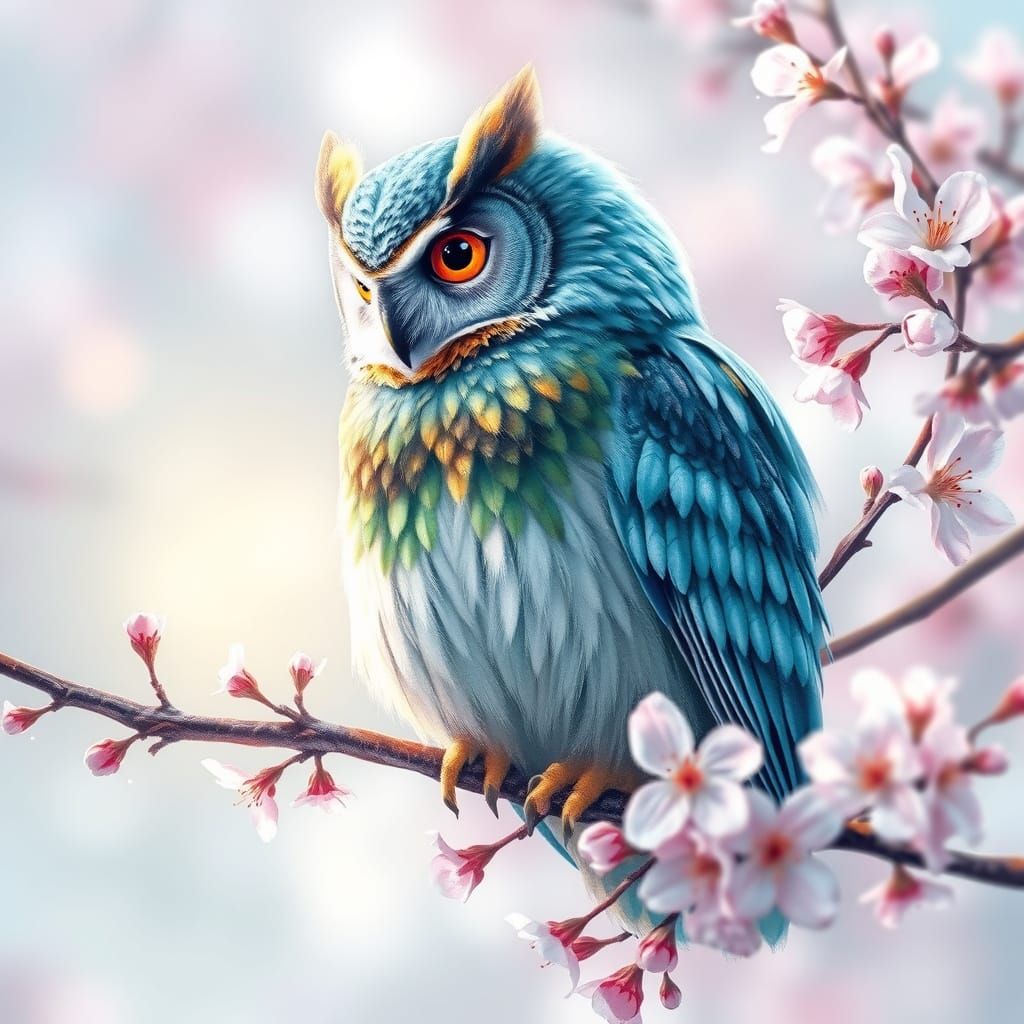 A highly detailed watercolor painting of a majestic owl with luminous blue, green, and gold feathers. It perches on a delicate cherry blossom branch with dew drops, set against a dreamy bokeh background.