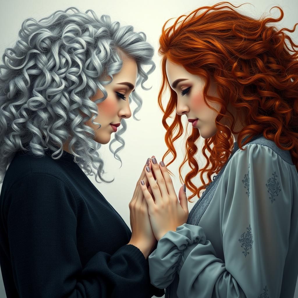 A touching scene of two women connected in compassion and support. The friends stand forehead to forehead, holding hands, illuminated by an ethereal glow. The image captures a dreamy, whimsical style.