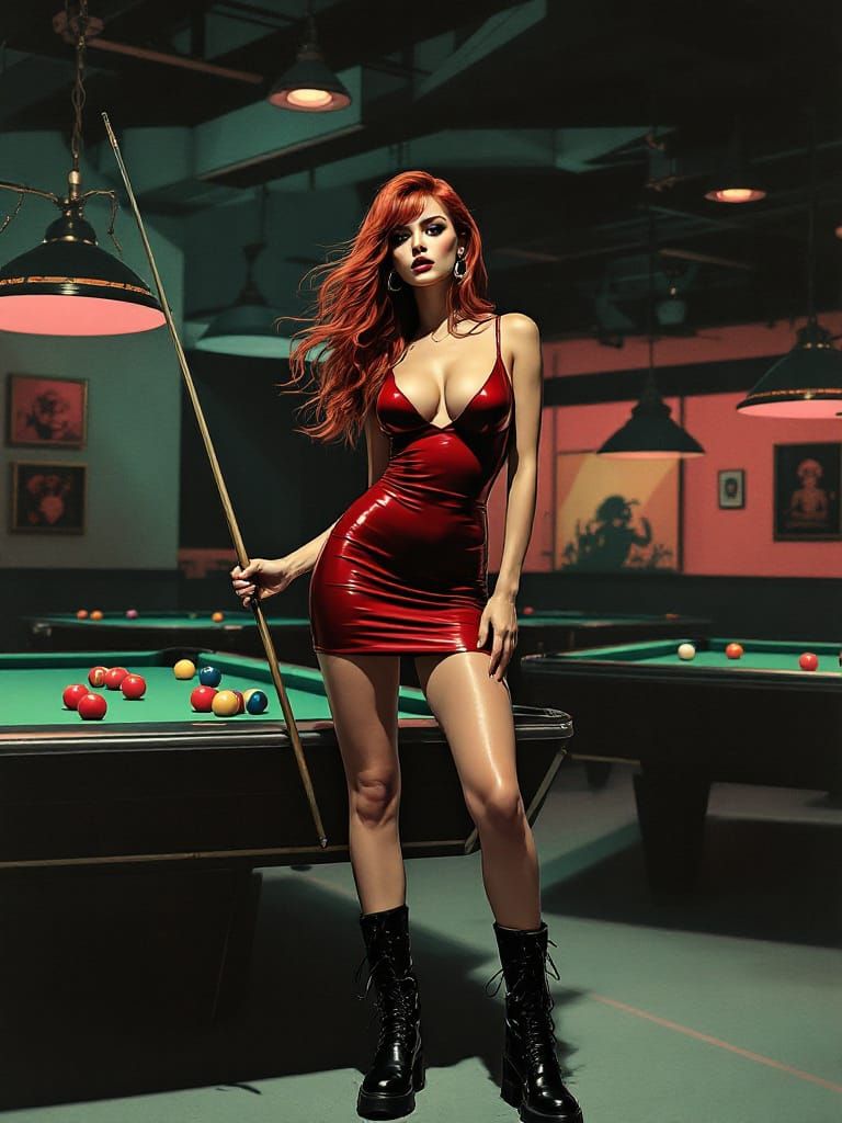 A woman in a red dress and boots holds a pool cue in a dimly lit hall. The image features glossy surfaces, sharp geometric backgrounds, and a darkly comedic suburban gothic aesthetic.