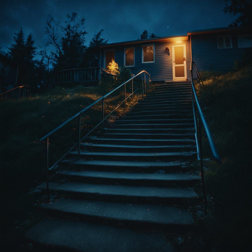 This cinematic image captures a dramatic and atmospheric outdoor staircase in a suburban setting at night, with warm tones, cool shadows, and a live-action feel.