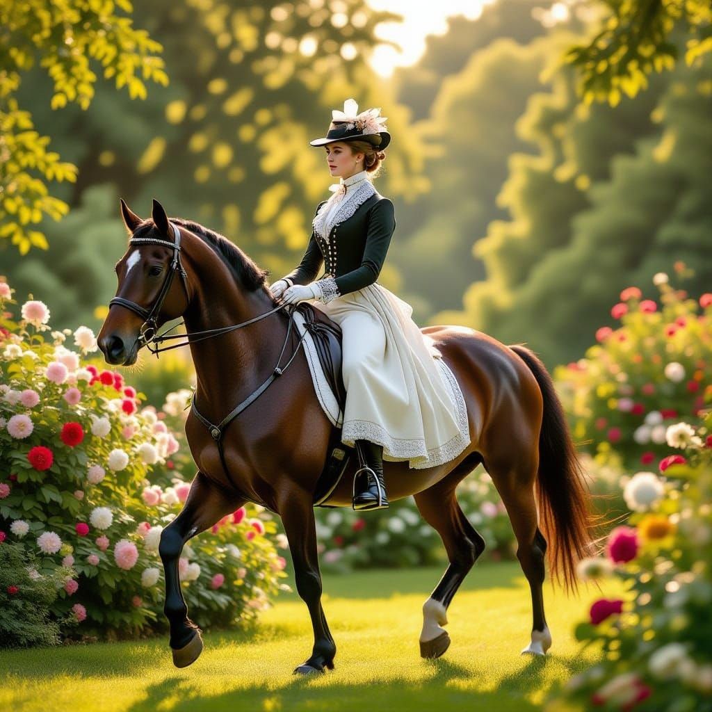 This image shows an ethereal young lady in Victorian attire riding a stately horse side-saddle through a vibrant, flower-filled park with a warm, nostalgic glow.