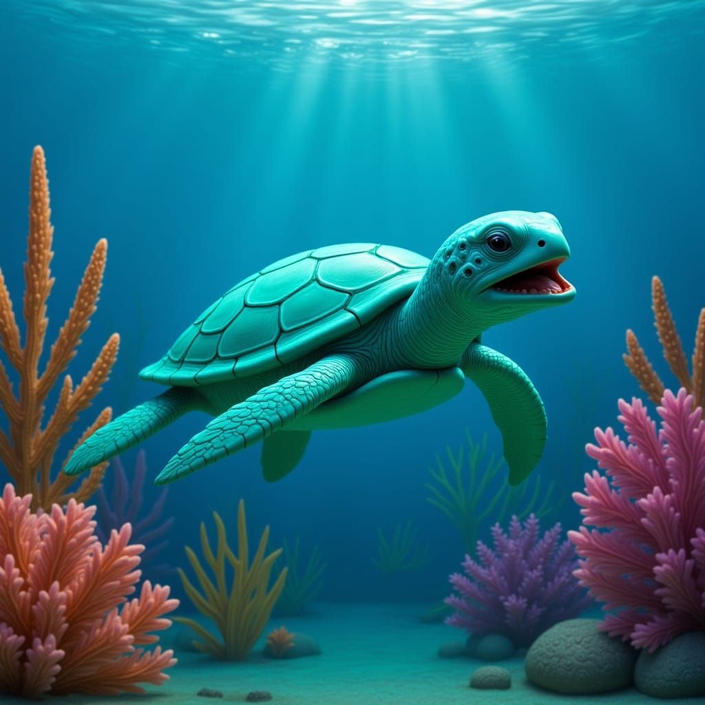 A peaceful sea turtle with glowing scales drifts among coral. The image evokes soft fantasy art with hyperrealistic details, reminiscent of digital painting.