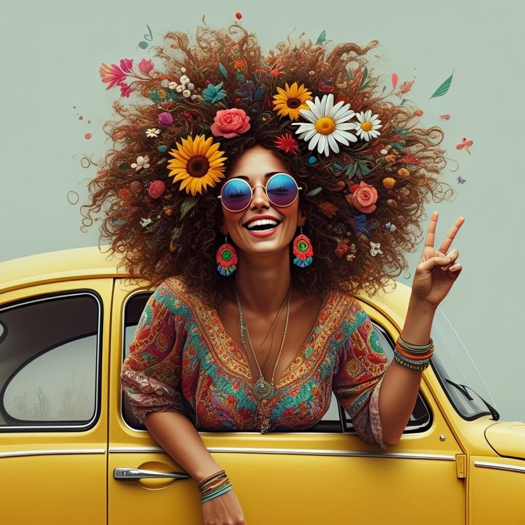A vibrant digital art piece featuring a carefree woman in a vintage car, surrounded by colorful flowers and eclectic details, blending octane render and hand-drawn textures in a whimsical style reminiscent of Loish and Lisa Congdon.