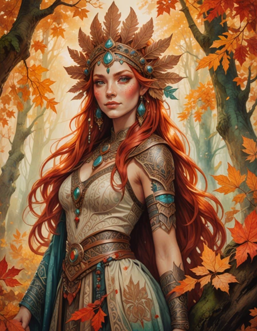A portrait of a mystical woman with teal eyes and long red hair in an enchanted autumn forest. The fantasy painting uses watercolor and ink to create a dreamy, ethereal scene with a warm glow.